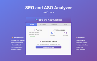 SEO & ASO Analyzer — это мощное расширение для браузера, разработанное для улучшения рабочих процессов SEO и ASO, предоставляя мгновенный анализ и предложения по оптимизации прямо в браузере Chrome. Этот бесплатный инструмент позволяет пользователям проводить полные SEO-аудиты одним щелчком мыши, предлагая идеи по заголовкам и метаописаниям, структуре заголовков и количеству ссылок. Он также оценивает изображения и видео по атрибутам ALT и проверяет мобильную оптимизацию, позволяя пользователям эффективно оптимизировать свои веб-страницы.